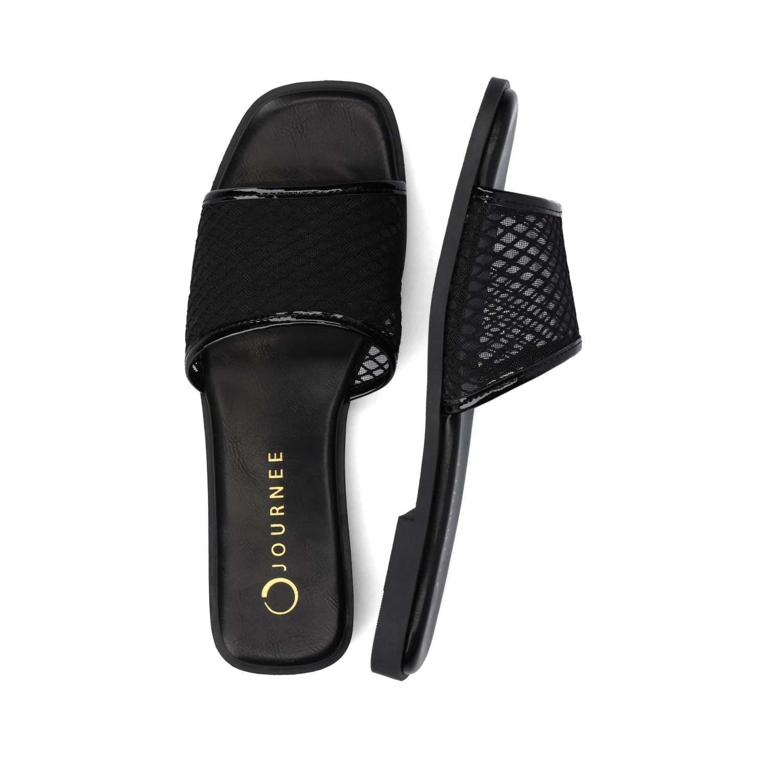 The Breckley Slip-On Sandal from Journee features a flat sole and a simple, effortless slip-on design. A thick mesh band across the top offers breathability and a secure fit. The cushioned insole provides comfort for all-day wear, making it perfect for casual occasions.